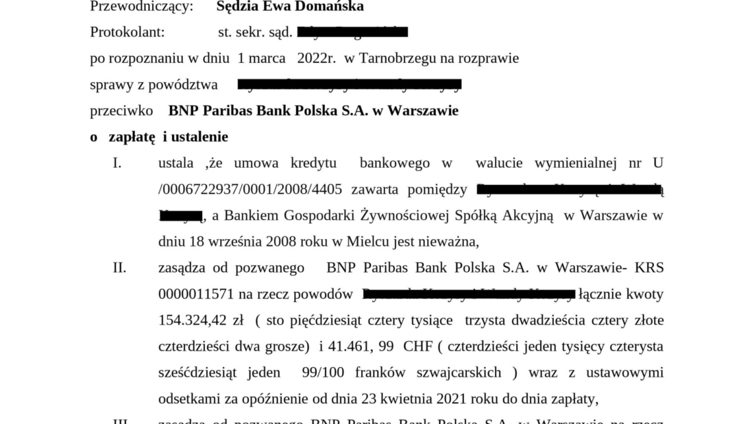 Sąd Okręgowy w Tarnobrzegu I Wydział Cywilny wyrokiem z dnia 1 marca 2022 r. ustalił, że umowa naszych Klientów zawarta z BGŻ (obecnie BNP Paribas) jest niewa ...