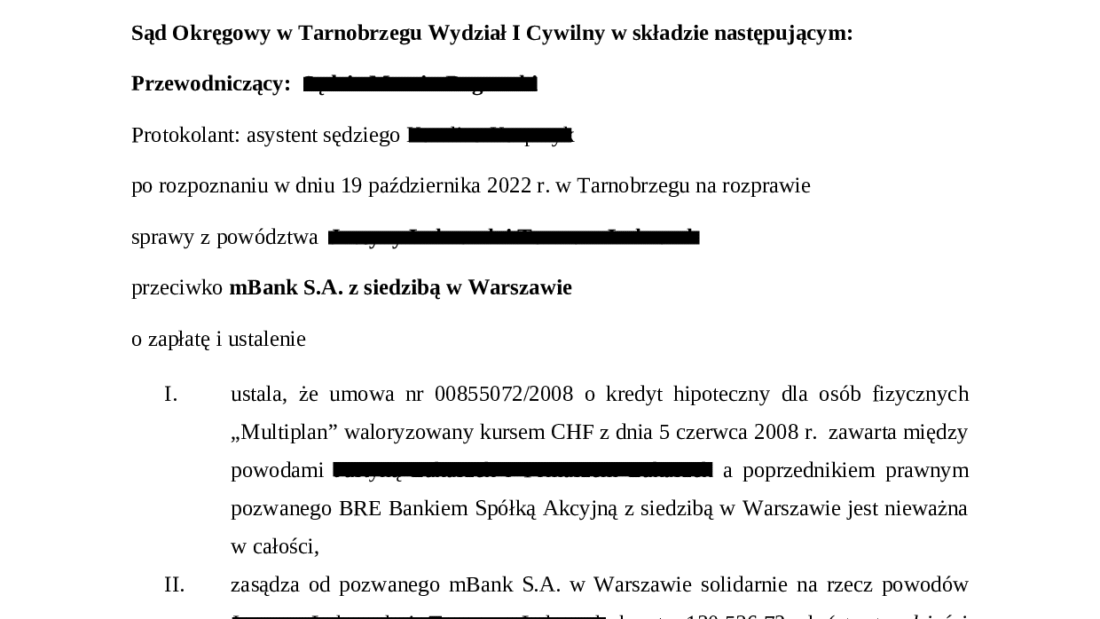 ✅Sąd Okręgowy w Tarnobrzegu Wydział I Cywilny wyrokiem z dnia 2 listopada 2022 r., I C 326/21 ustalił, że umowa o kredyt hipoteczny dla osób fizycznych „Multiplan” waloryzowany kursem CHF jest nieważna w całości oraz zasądził od pozwanego mBank S.A. w Warszawie solidarnie na rzecz powodów kwotę 130 536,72 zł oraz kwotę 31.333,93 CHF z odsetkami ustawowymi za opóźnienie od 11 maja 2021 r. do dnia zapłaty.