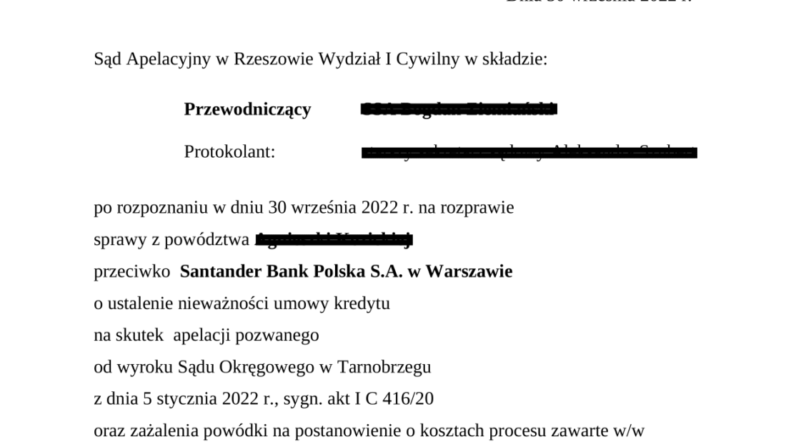 Sąd Apelacyjny w Rzeszowie wyrokiem z dnia 30 września 2022 r. oddalił zarówno apelację banku od wyroku Sądu Okręgowego w Tarnobrzegu z dnia 5 stycznia 2022 r., I C 416/20 (I ACa 72/22), jak i zażalenie skierowane w imieniu naszej Klientki na koszty procesu (I ACz 30/22) i obciążył bank zwrotem kosztów postępowania apelacyjnego.