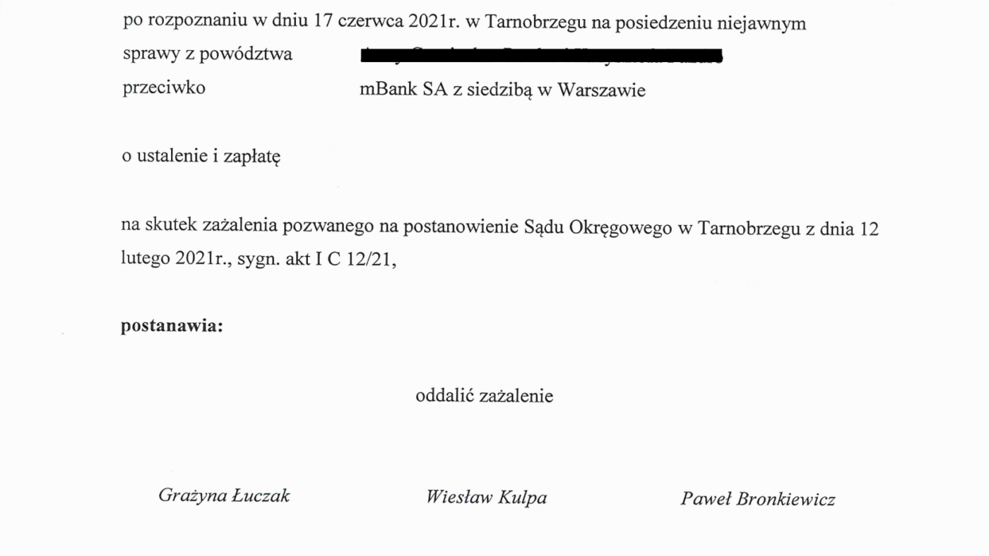 Prawomocne postanowienie Sądu II instancji o zabezpieczeniu powództwa w Sądzie Okręgowym w Tarnobrzegu! Postępowanie dotyczy umowy kredytobiorców dawnego BRE Banku (obecnie mBank S.A.). Postanowieniem z dnia 12 lutego 2021 r. Sąd zabezpieczył powództwo ...