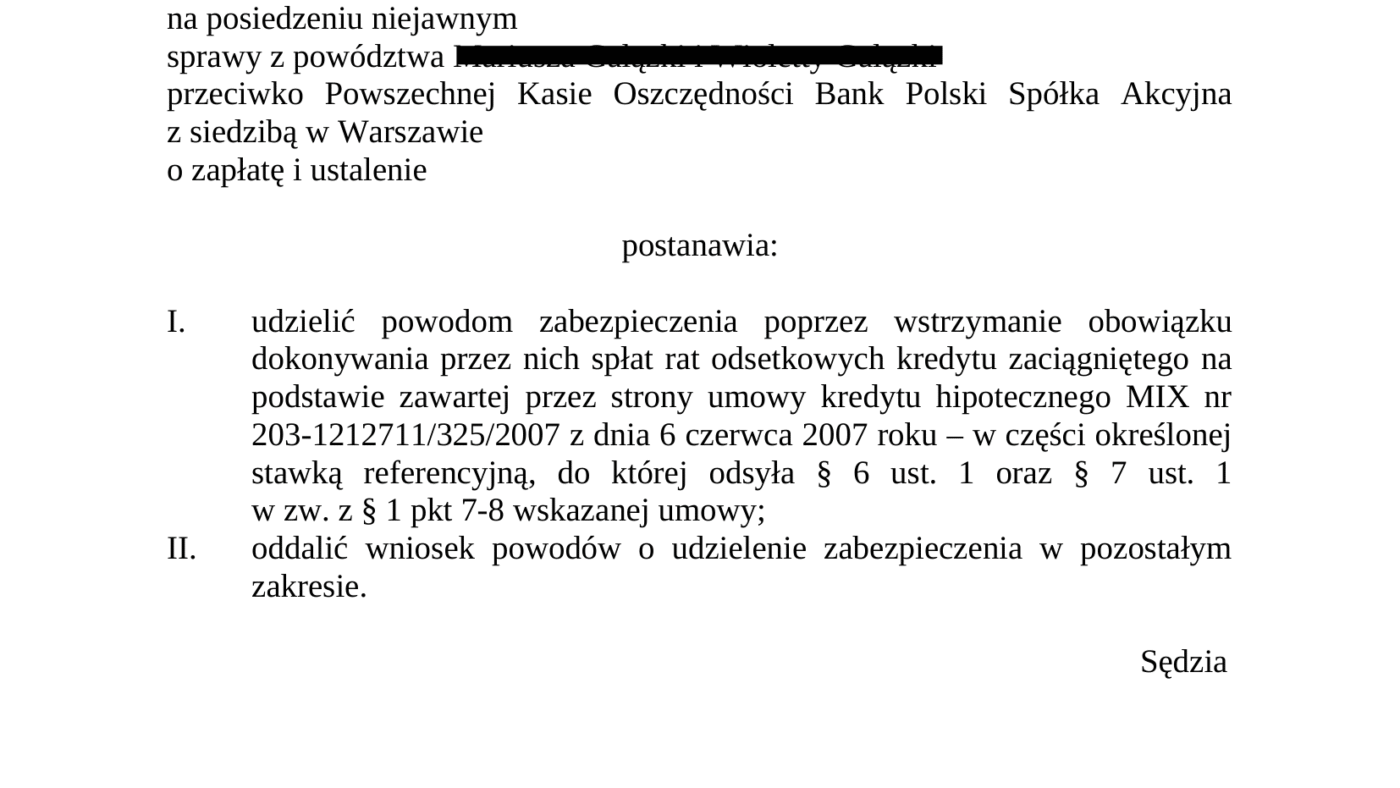 Sąd Okręgowy w Krośnie wydał postanowienie o udzieleniu zabezpieczenia w sprawie kredytu hipotecznego opartego na WIBOR. Na czas trwania procesu sąd wstrzymał obowiązek spłaty rat odsetkowych w części wynikającej ze stawki WIBOR To istotna decyzja d ...