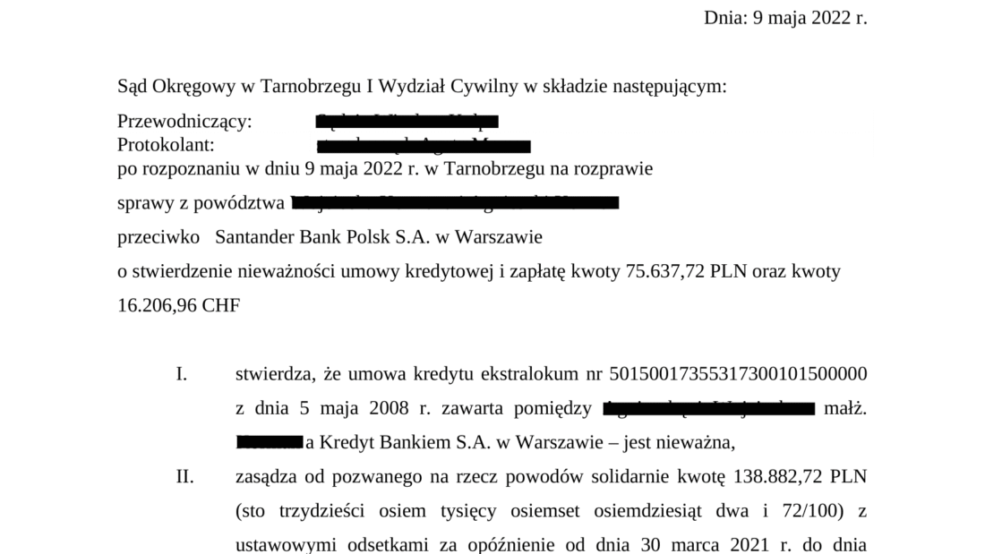 Sąd Okręgowy w Tarnobrzegu Wydział I Cywilny wyrokiem z dnia 9 maja 2022 r., sygn. akt I C 271/21 stwierdził, że umowa d. Kredyt Banku – Ekstralokum z 2008 r. jest nieważna. Całe postępowanie trwało nieco ponad rok – pozew złożony 1 kwietnia 2021 r. W toku sprawy sąd przesłuchał świadków-pracowników banku na piśmie i na jednej rozprawie przesłuchał kredytobiorców. Sąd zasądził na rzecz powodów całą kwotę dochodzonego pozwem roszczenia w złotych polskich dokonując przeliczenia kwot wpłaconych przez nich w CHF wg kursu średniego NBP z dnia spłaty rat – zgodnie z opinią biegłego wydaną w sprawie.