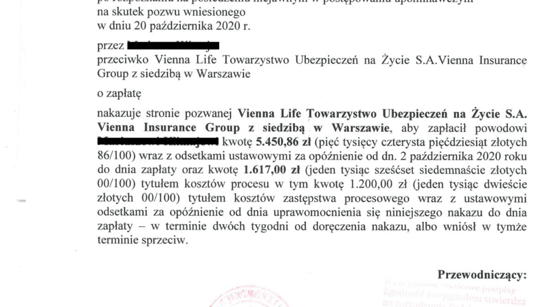 Vienna Life Towarzystwo Ubezpieczeń na Życie S.A. po raz kolejny przegrało spór sądowy z Ubezpieczonym reprezentowanym przez adowkatów naszej Kancelarii. Sąd Rejonowy w Dąbrowie Tarnowskiej nakazał Vienna Life TU na Życie S.A. Vienna Insurance Group zwrot kwoty ponad 5000,00 zł wraz z ustawowymi odsetkami za opóźnienie oraz kwotę 1 617,00 zł tytułem zwrotu kosztów postępowania.