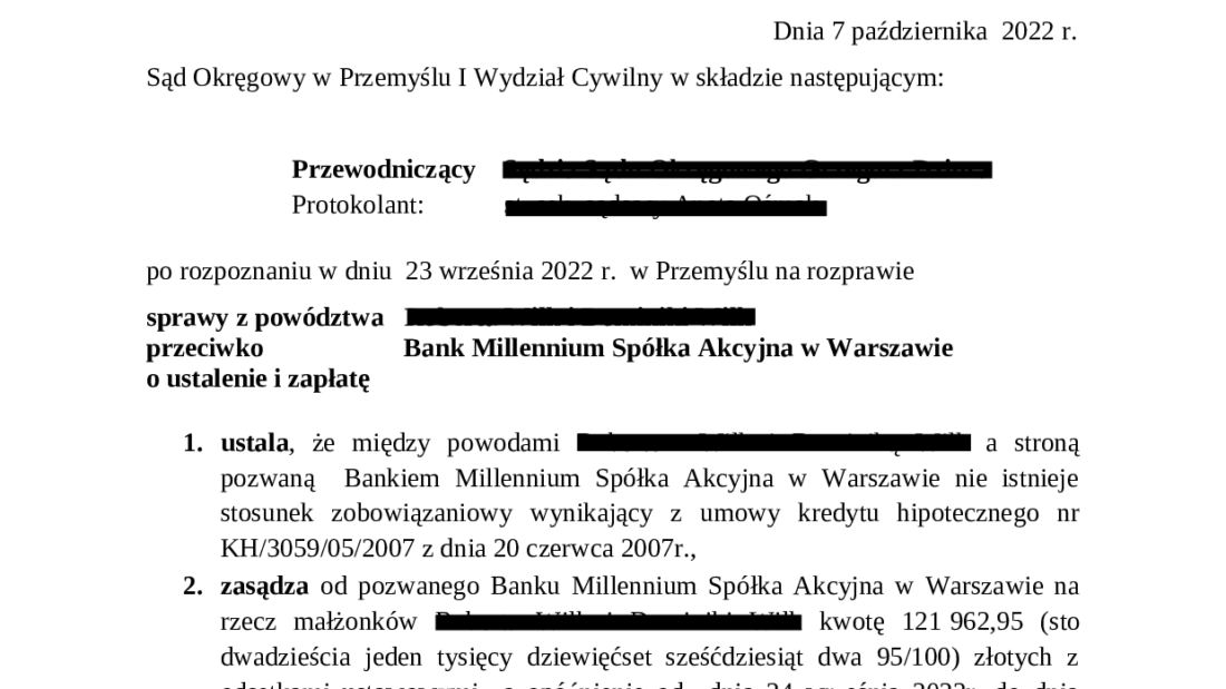 ✅Sąd Okręgowy w Przemyślu I Wydział Cywilny wyrokiem z dnia 7 października 2022 r., I C 158/22 ustalił, że między kredytobiorcami a Bankiem Millennium Spółka Akcyjna w Warszawie nie istnieje stosunek zobowiązaniowy wynikający z umowy kredytu hipotecznego.
